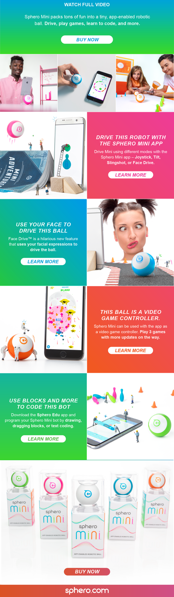 Sphero Mini is a miniaturized version of Sphero's original app-enabled robotic ball. For the package, I wanted to do something energetic and imply movement. Utilizing the colors of the product and form-factor of a ball, I created a dot striation that creates a continuous pattern across the front when lined up on shelf. The campaign follows the packaging visual direction. We took a series of photos with HO scale figures to make mini look small but BIG! Mini is a complex product with a deep play experience so we captured this by having the figures play with the different features.